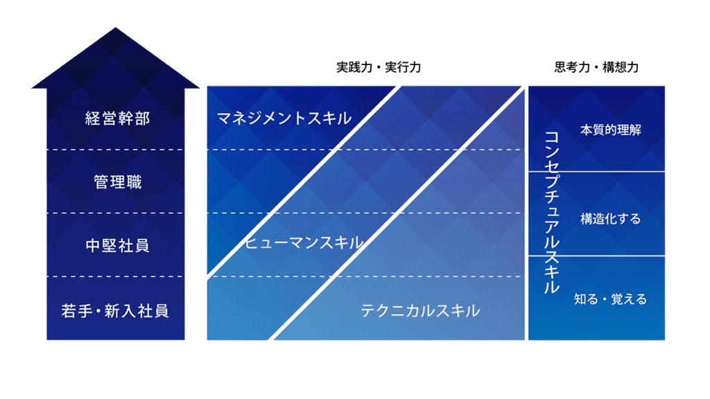 先程お伝えした階層を上げる、という考えを補強するためには、「各階層の社員にどのような動きを期待するのか」を考えることが不可欠です。例えば、新入社員であれば、「基礎的なビジネスマナー」を身につけて欲しいですし、若手社員になれば「主体的に挑戦する」ようになって欲しいと思いますよね。加えて、業務内容によっては「基礎的なITスキル」や「マネジメントスキル」を身に着けて欲しいと思います。