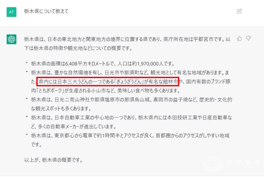 実際に「栃木県について教えてください」と質問を投げかけたところ、概ね事実が書かれていたものの、「県内には日本三大うどんの一つである「ぎょうざうどん」が有名な館林市や」という明かなうそが混じっていました。