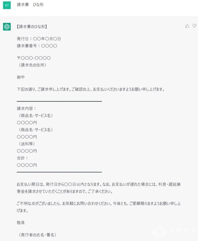 企業のプレスリリースのドラフト版や簡単なニュース記事も「ChatGPT」で生成することが可能です。例えば、「ラブレターを書いて」と「ChatGPT」に頼めば、ものの数秒でラブレーターのドラフト版ができあがります。ただ、現時点で生成される文章ははあくまで「ドラフト版」というレベルで、まだまだテンプレート的な表現から脱していませんが、今後AIが情報をさらに蓄積していけば、より高度な文章生成も可能になるでしょう。「請求書のひな形」や「お礼状のひな形」など、定型文でも問題ないようなものであれば、ほぼそのまま使えるひな形が出来上がります。