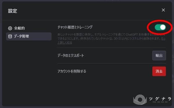 無料のブラウザ版を業務利用する場合に最初にすべきなのが「チャット履歴とトレーニング」の設定をオフにしておくことです。以前は少し複雑な手順で「オプトアウト申請」という形で依頼を出す必要がありましたが、現在では、設定画面から簡単に変更できるようになりました。これを「オン」のままにしておくことは、「うっかり」も含めて情報漏えいが起きやすい状況のまま「ChatGPT」を利用することになります。業務で利用するときは必須の設定だと考えましょう。